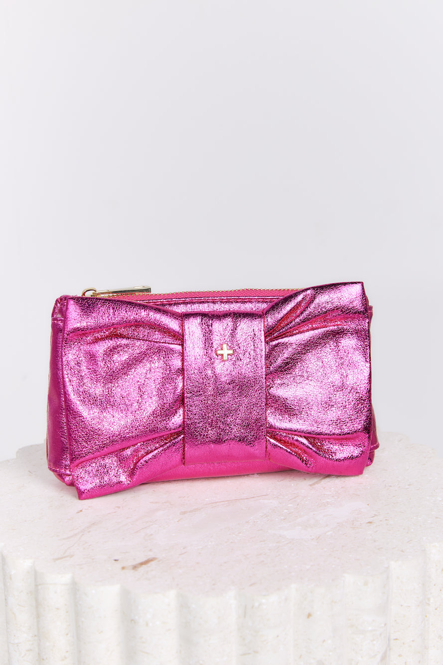 This bag is a dazzling statement piece made for standout moments. With its shimmering finish and signature bow detail, this compact crossbody brings instant glam to any outfit. The zip fastening keeps essentials secure, while the removable strap lets you switch between crossbody and clutch style with ease. Inside, a spacious main compartment and two pockets keep things organized. Perfect for parties, nights out, or adding sparkle to your day-to-day look.