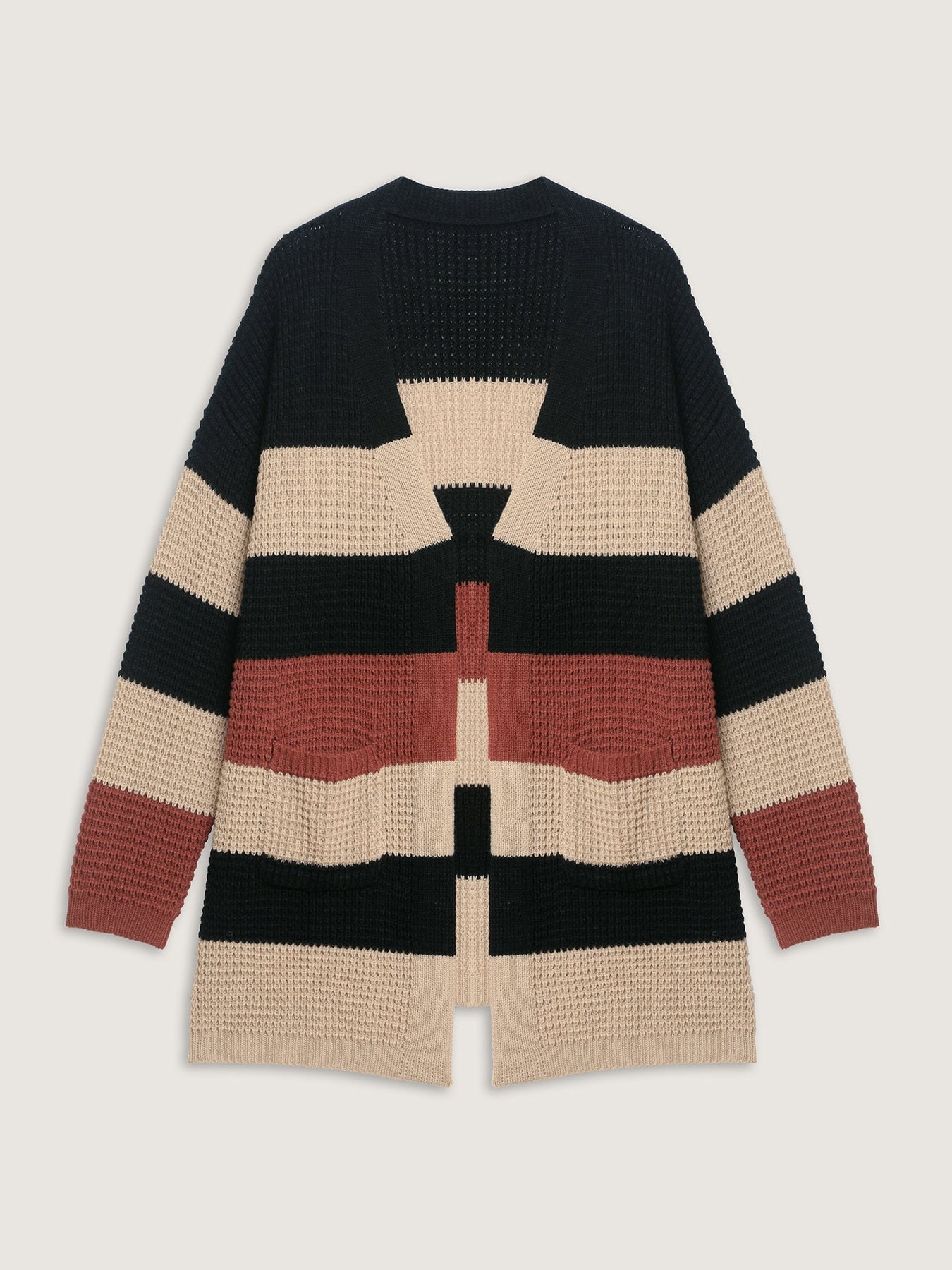 Stay cozy and chic in this women’s striped open-front cardigan. Featuring bold color-block stripes in black, beige, and rust tones, this cardigan brings instant style to any casual look. The chunky knit texture adds warmth and comfort, while the relaxed silhouette and open-front design make it perfect for layering. Whether paired with jeans, leggings, or shorts, this cardigan is your go-to for effortless everyday elegance.