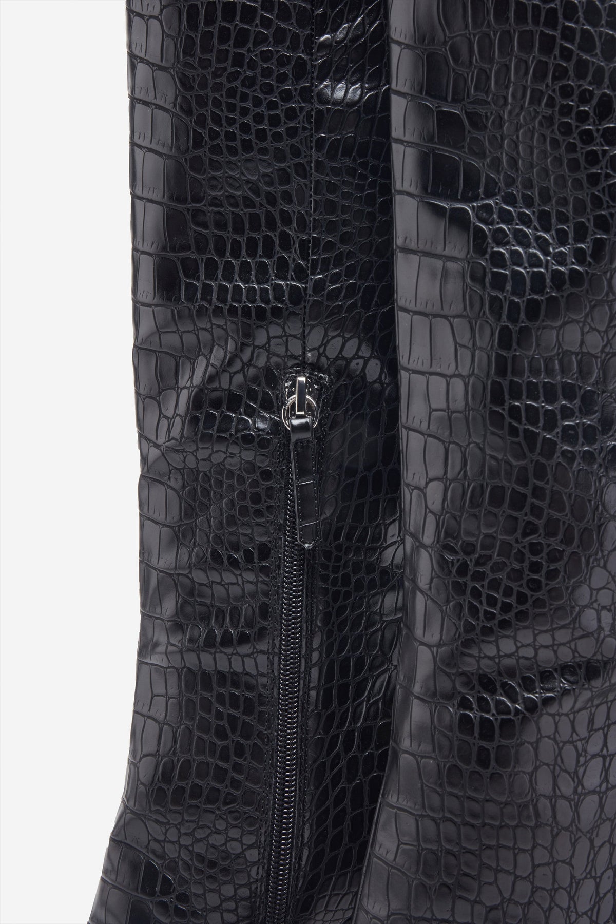 Turn heads wherever you go with these croc-embossed patent knee-high pointed boots. Crafted from high-shine faux leather with a chic crocodile texture, these boots redefine statement footwear. The pointed toe and slender stiletto heel create a sleek, elongated silhouette, while the inner zip closure ensures a snug and comfortable fit. Perfect for both day and night, these boots add a touch of luxury and confidence to any outfit.