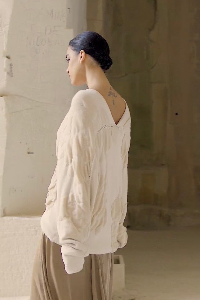 This oversized jacquard knit sweater is a modern expression of texture and ease. Crafted from a soft cotton blend, it features an asymmetrical jacquard pattern that wraps around the body in a play of intricate knits. The double V-neckline adds a graceful touch, while semi-sheer seam detailing enhances its contemporary charm. Perfect for relaxed sophistication, this piece pairs beautifully with tailored trousers or flowy skirts, embodying quiet luxury in every stitch.
