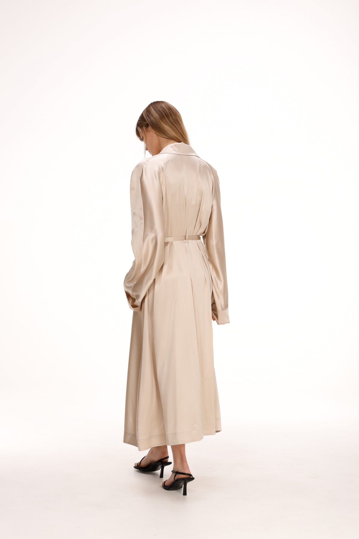 This women’s long trench coat combines timeless design with a fluid drape, creating a look that feels both structured and graceful. Its elongated cut enhances movement while the raglan sleeves add ease and a relaxed refinement. Thoughtfully placed side pockets bring subtle practicality to the streamlined design. Finished with button details and cuffed sleeves, it is a statement piece that transitions seamlessly from day to evening. A versatile coat that captures effortless sophistication.
