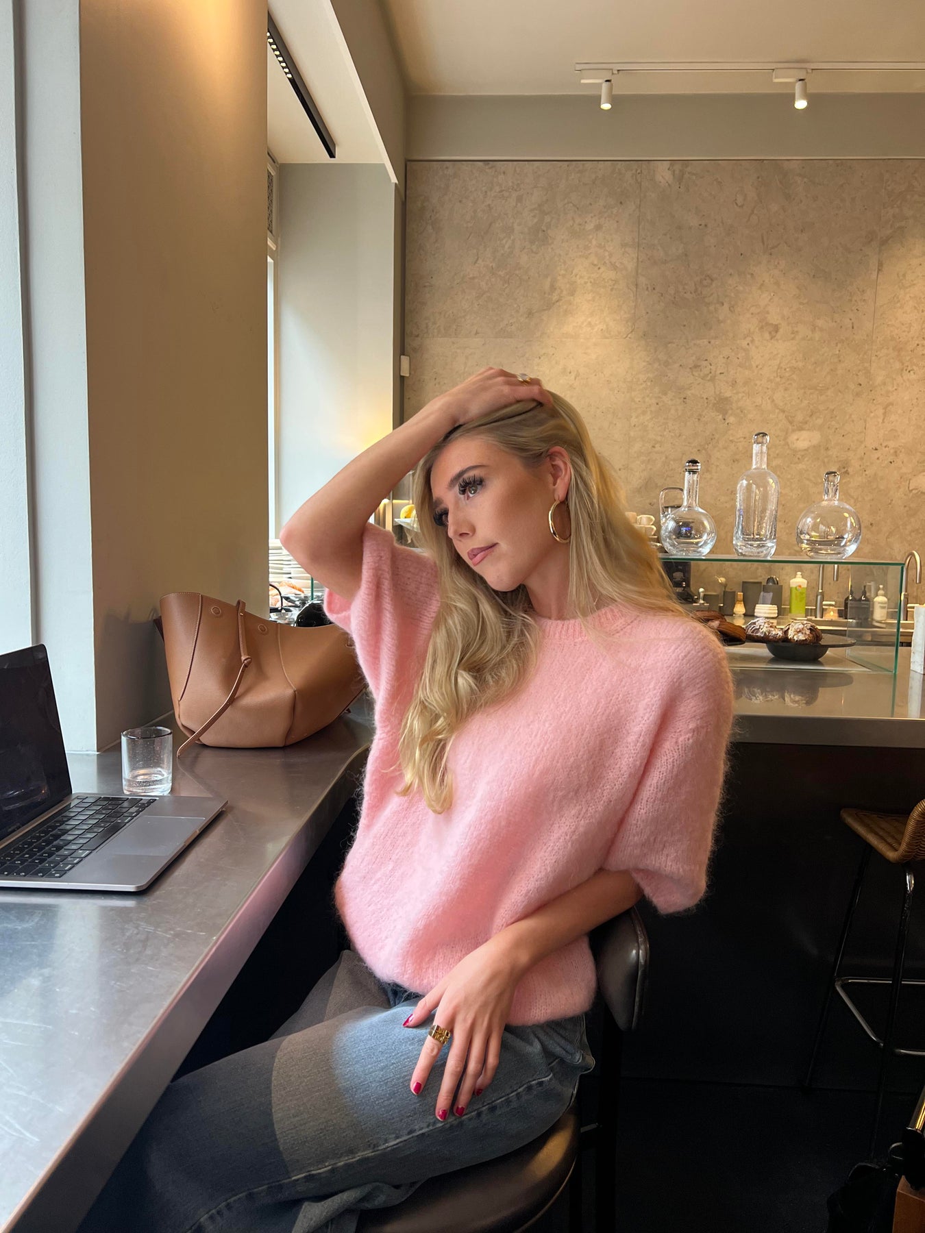 The Faye sweater is styled with a t-shirt fit, a loose silhouette, and a round ribbed neckline for a balanced look. Its versatile design makes it easy to wear as a standalone piece or layered across seasons.
