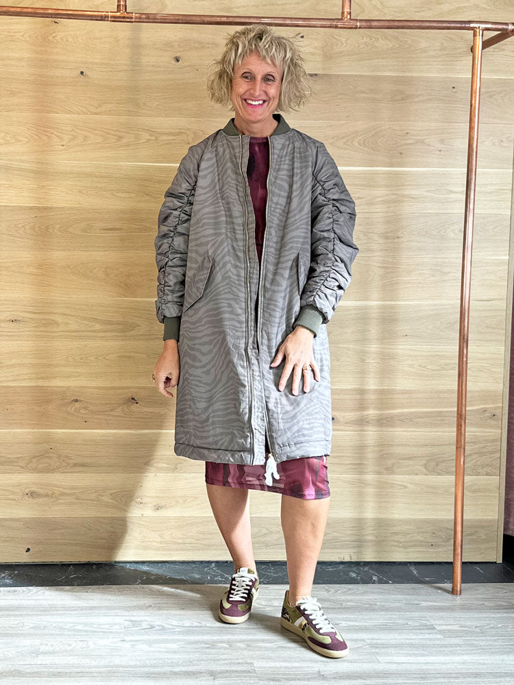 Step into standout style with the long zebra print bomber jacket, where modern design meets relaxed sophistication. This longline bomber jacket showcases a subtle zebra print, giving it a chic twist on the classic bomber silhouette. Crafted from lightweight polyester with ribbed neck and cuffs, it offers both comfort and style. The gathered sleeves, two-way zipper, and flap pockets add functional details, while the long cut creates a flattering, street-chic look that transitions seamlessly from casual days to city nights.